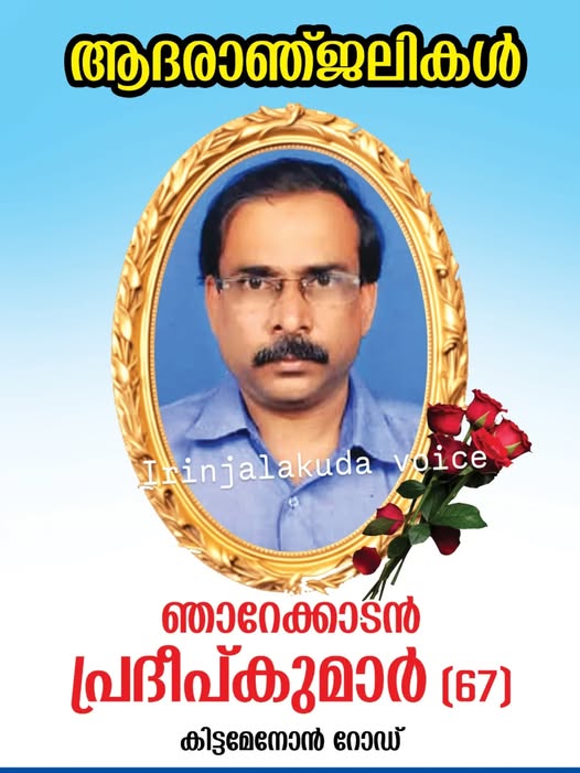 ഇരിങ്ങാലക്കുട : കാരുകുളങ്ങര പാലം സ്റ്റോപ്പിനു സമീപം പ്രവർത്തിക്കുന്ന പി എൻ ജി ബ്രൈറ്റ് ലോണ്ട്രി സർവ്വീസസ് ഉടമ കിട്ടമേനോൻ റോഡ് “ഉദയം” വീട്ടിൽ പ്രദീപ് കുമാർ (67) നിര്യാതനായി.സംസ്കാരം ഇന്നു വൈകീട്ട് 4 മണിക്ക് മുക്തിസ്ഥാനിൽ.ഭാര്യ : ഗിരിജ.മക്കൾ : അർജ്ജുൻ, വിഷ്ണു.മരുമകൾ : അമൃത