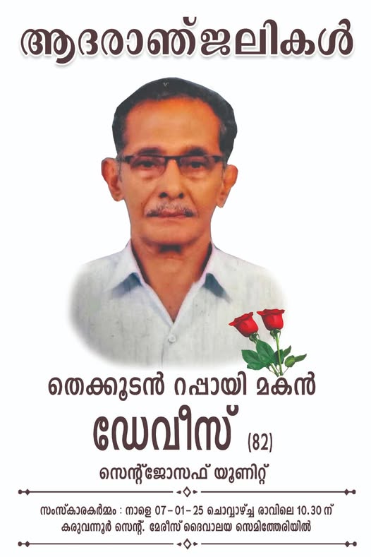 സംസ്ക്കാരം ചൊവ്വാഴ്ച്ച രാവിലെ 10.30 ന് കരുവന്നൂര് സെന്റ് മേരീസ് ദേവാലയ സെമിത്തേരിയില്.ഭാര്യ കൊച്ചുത്രേസ്യ.മക്കള് ഡെറ്റി, ഡെയ്സണ്.മരുമക്കള് സെബില് ജോര്ജ്ജ്,സ്റ്റെഫി ഡെയ്സണ്