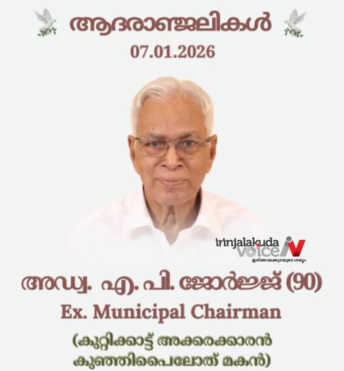 ഇരിങ്ങാലക്കുട: മുൻ നഗര സഭ ചെയർമാനും കെഎ സ്ഇ കമ്പനിയുടെ മാനേജിംഗ് ഡയറക്ടറുമായിരുന്ന തെക്കേ അങ്ങാടി കുറ്റിക്കാട്ട് അക്കരക്കാരൻ വീട്ടിൽ അഡ്വ.എ.പി.ജോർജ് (90) അന്തരിച്ചു. സംസ്കാരം വെള്ളിയാഴ്ച്ച രാവിലെ 11ന് ഇരിങ്ങാലക്കുട സെന്റ് തോമസ് കത്തീഡ്രലിൽ. കെഎസ്ഇ കമ്പനിയുടെ സുഗമമായ നടത്തിപ്പിനു ചുക്കാൻ പിടിച്ച് ഏറ്റവും ഒടുവിലായി വിരമിച്ച സ്ഥാപക ഡയറക്ടർമാരിലൊരാളാണ്. 1994 മുതൽ കെഎസ്ഇ കമ്പനിയുടെ ഡയറക്ടർ ആൻഡ് ലീഗൽ അഡ്വൈസറായും 2015 മുതൽ എക്സിക്യുട്ടീവ് ഡയറക്ടറായും 2018 മുതൽ 2021 വരെ മാനേജിംഗ് ഡയറക്ടറായും […]
