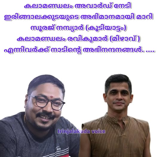 കലാമണ്ഡലം അവാർഡ് നേടി ഇരിങ്ങാലക്കുടയുടെ അഭിമാനമായി മാറിയ സൂരജ് നമ്പ്യാർ (കൂടിയാട്ടം)കലാമണ്ഡലം രവികുമാർ (മിഴാവ് ) എന്നിവർക്ക് നാടിന്റെ അഭിനന്ദനങ്ങൾ. ….